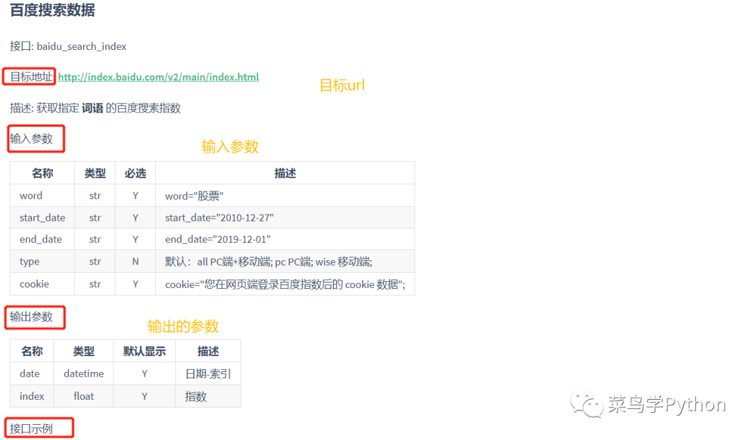 以百度的搜索数据为例,我们需要重点关注的有四个点,分别是目标地址、输入参数、输出参数和接口示例,其中接口示例给出了程序如何调用的详细说明,让大家一看就明白该如何使用。