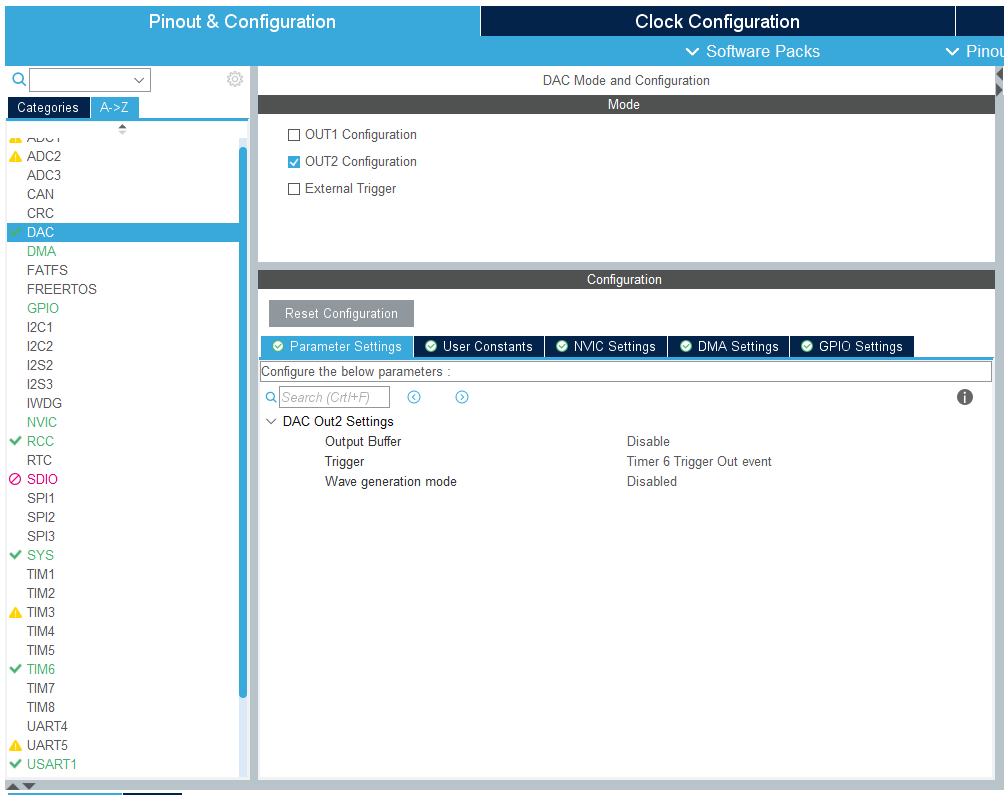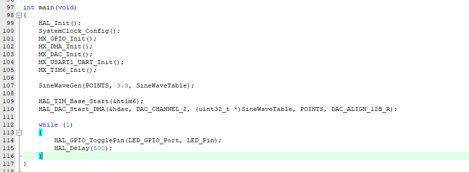 HAL_TIM_Base_Start(&htim6);HAL_DAC_Start_DMA(&hdac, DAC_CHANNEL_2, (uint32_t *)SineWaveTable, POINTS, DAC_ALIGN_12B_R);