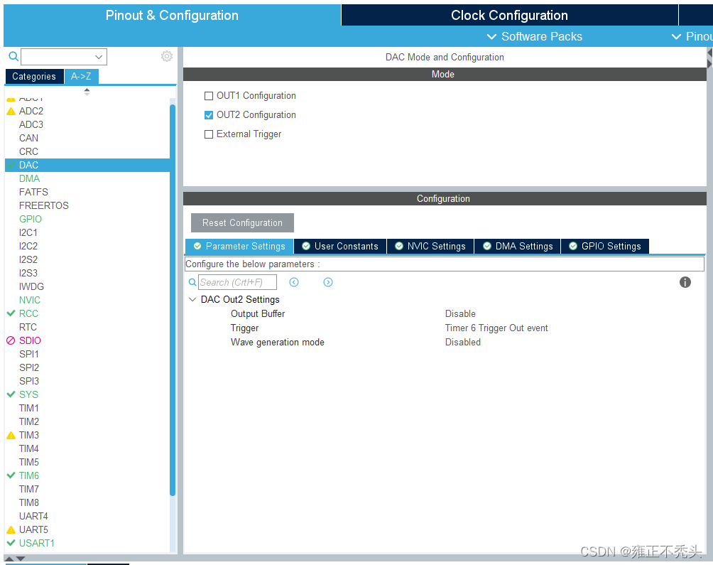 选择DAC的触发方式,可以选择为定时器触发、外部中断触发和软件触发。这里我选择了定时器6来触发DAC,因为通过设置定时器的频率就可以很方便的控制DAC输出的正弦波频率。