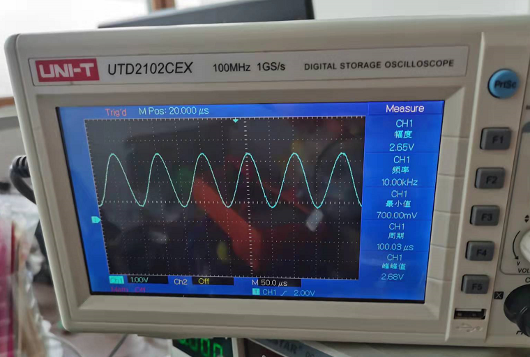上面说到过我的设置是一个周期内100个点,定时器触发频率为1MHz,触发一百次才能完成一个周期的波形,所以生成的波形频率就是1MHz/100个点=10KHz。