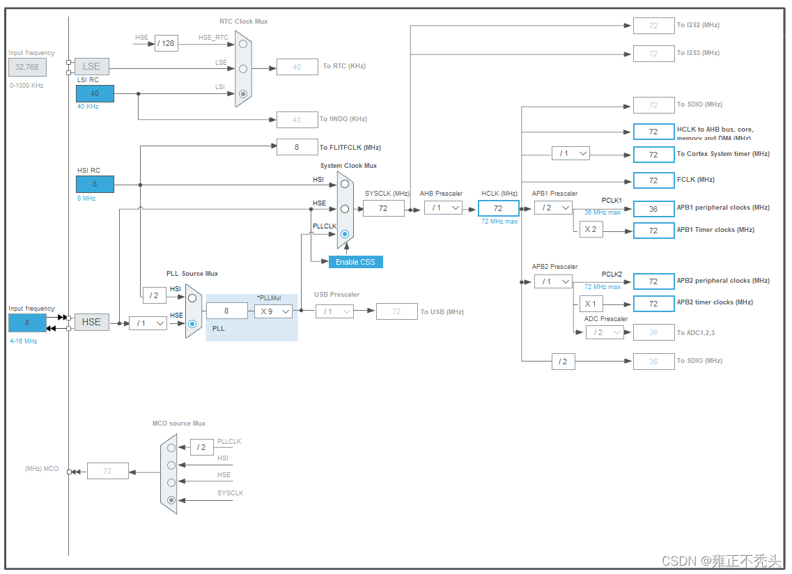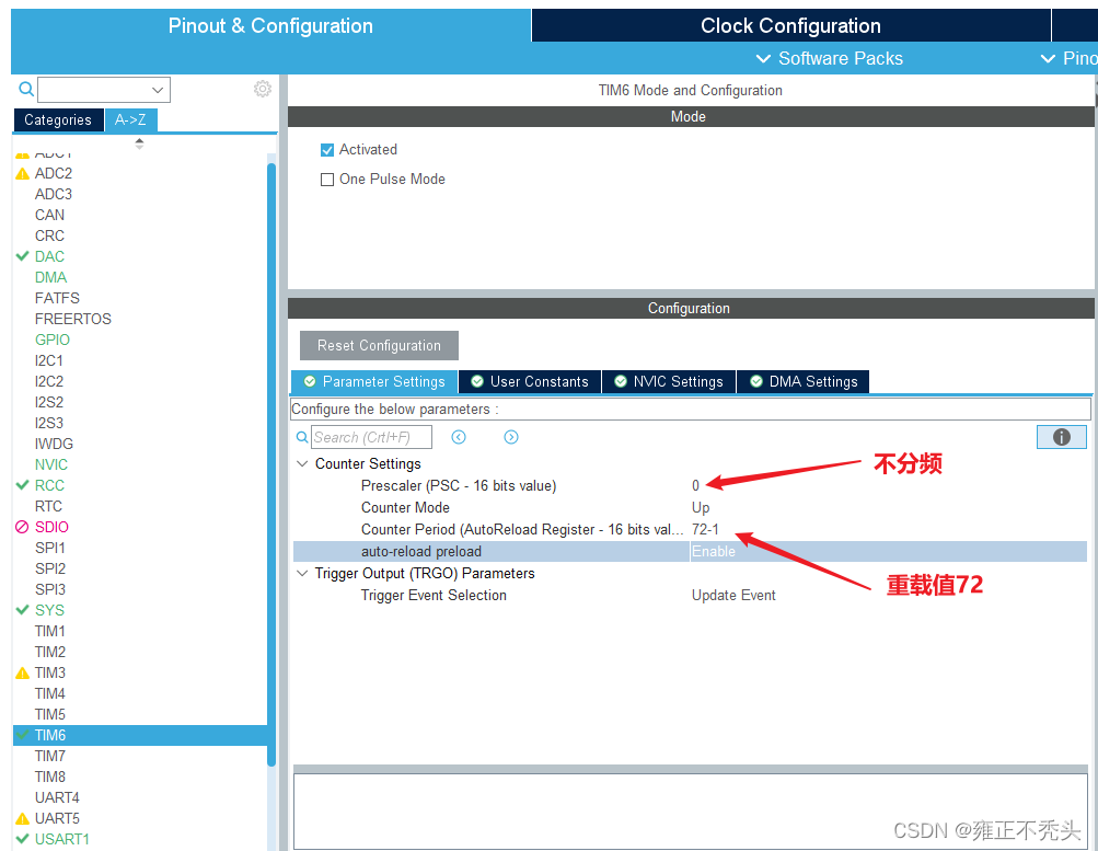 定时器6的时钟主频为72MHz,我这里没有分频,那么把重载值设置为72,这样就得到了72M/72=1MHz的触发频率。