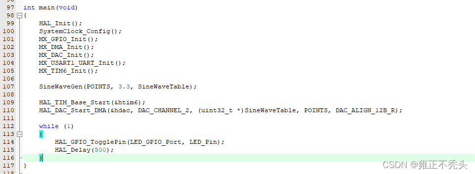 #endifint i = 0;double radian = 0; // 弧度double setup = 0; // 弧度和弧度之间的大小double voltage = 0; // 输出电压setup = (2 * PI) / NPoints; // 两点之间的间距while (i < NPoints){voltage = VMaxRange / 2.0 * (sin(radian) + 1.0); // 计算电压SineWaveTable[i] = (uint16_t)(voltage * 4096 / 3.3); // 电压转为DAC数值radian += setup; // 下一个点的弧度i++;}