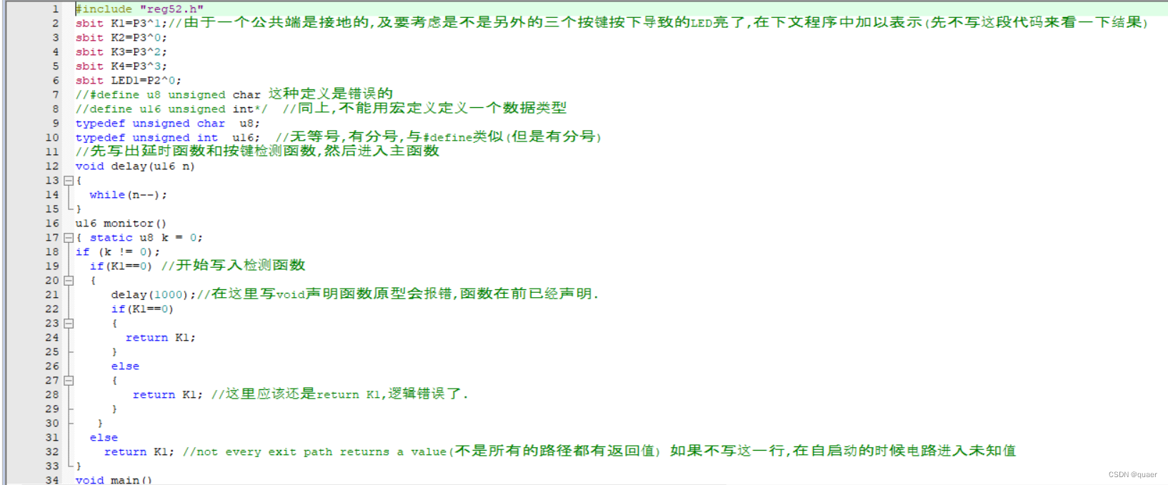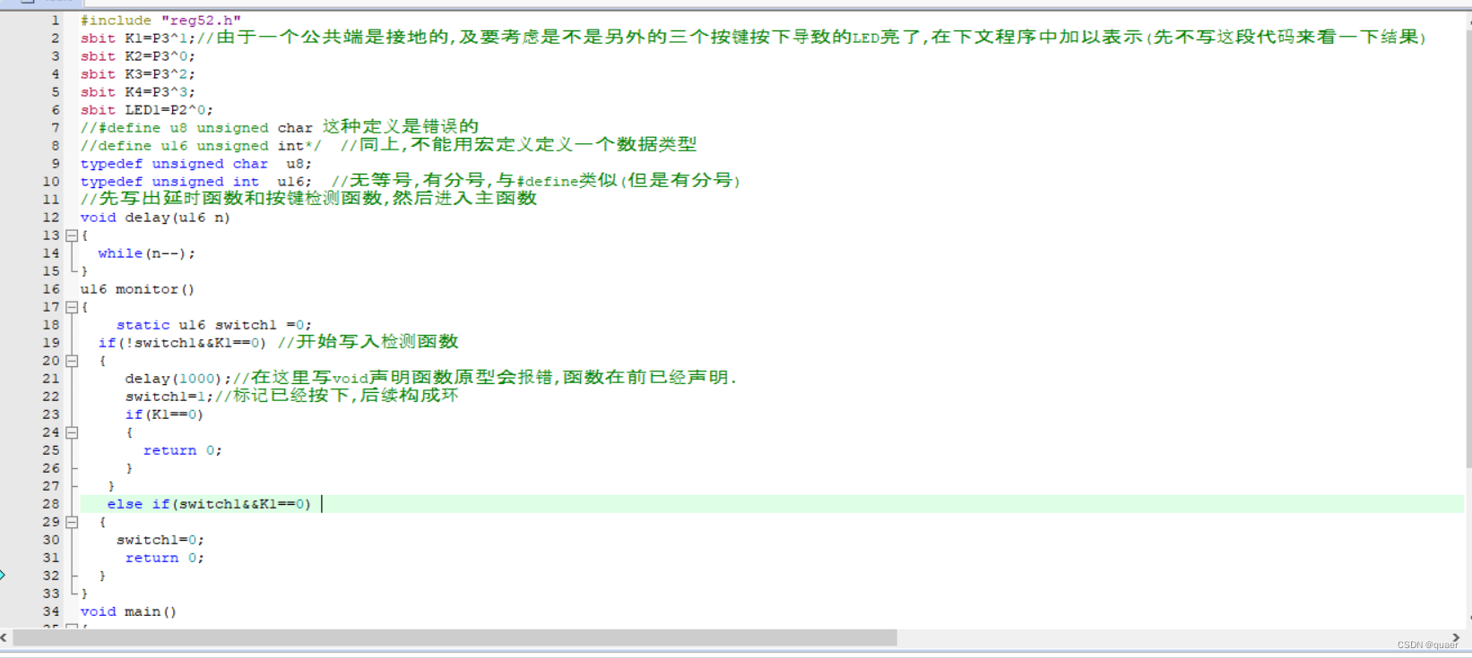 sbit K1=P3^1;//由于一个公共端是接地的,及要考虑是不是另外的三个按键按下导致的LED亮了,在下文程序中加以表示(先不写这段代码来看一下结果)