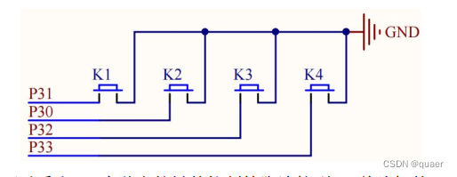 独立按键的电路结构如上图所示,各个按键的一个管脚都是接地,另外的一个管脚分别连接到P31,P30,P32,P33.(K1,K2,K3,K4)