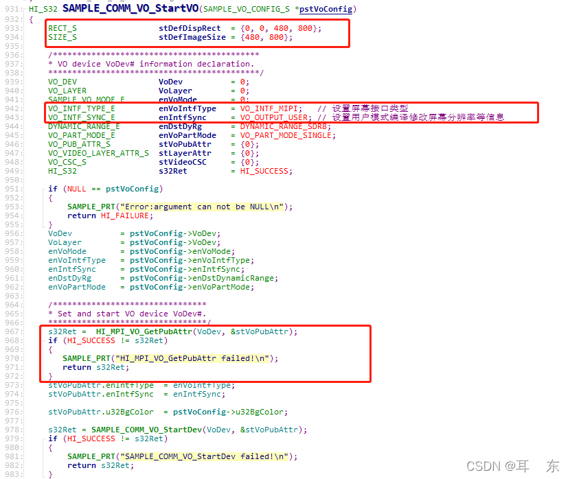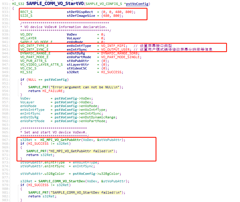 /************************************************step5: start VO*************************************************/RECT_S stDefDispRect = {0, 0, 480, 800};SIZE_S stDefImageSize = {480, 800};stVoConfig.VoDev = SAMPLE_VO_DEV_UHD;stVoConfig.enVoIntfType = VO_INTF_MIPI; // 屏幕使用mipi接口stVoConfig.enIntfSync = VO_OUTPUT_USER; // 方便配置添加屏幕的分辨率及初始化stVoConfig.enPicSize = enDispPicSize;stVoConfig.u32BgColor = COLOR_RGB_BLUE;stVoConfig.u32DisBufLen = 3;stVoConfig.enDstDynamicRange = DYNAMIC_RANGE_SDR8;stVoConfig.enVoMode = VO_MODE_1MUX;stVoConfig.enPixFormat = PIXEL_FORMAT_YVU_SEMIPLANAR_420;#if 0 stVoConfig.stDispRect.s32X = 0;stVoConfig.stDispRect.s32Y = 0;stVoConfig.stDispRect.u32Width = stDispSize.u32Width;stVoConfig.stDispRect.u32Height = stDispSize.u32Height;stVoConfig.stImageSize.u32Width = stDispSize.u32Width;stVoConfig.stImageSize.u32Height = stDispSize.u32Height;#else // 使用用户设置的屏幕分辨率stVoConfig.stDispRect = stDefDispRect;stVoConfig.stImageSize = stDefImageSize;#endifstVoConfig.enVoPartMode = VO_PART_MODE_SINGLE;printf("screen w = %d h = %d\n", stVoConfig.stDispRect.u32Width, stVoConfig.stDispRect.u32Height);s32Ret = SAMPLE_COMM_VO_StartVO(&stVoConfig);if(s32Ret != HI_SUCCESS){SAMPLE_PRT("start VO fail for %#x!\n", s32Ret);goto END5;}