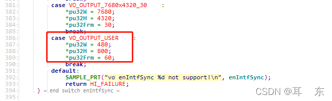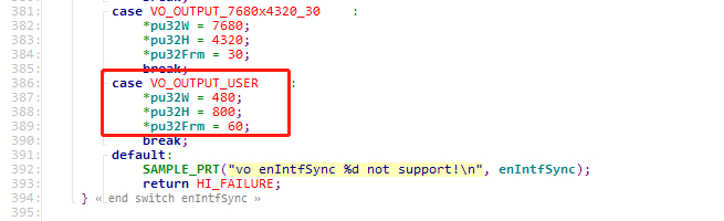switch(enVoIntfSync){case VO_OUTPUT_576P50:pstMipiTxConfig = &MIPI_TX_720X576_50_CONFIG;break;case VO_OUTPUT_720P60:pstMipiTxConfig = &MIPI_TX_1280X720_60_CONFIG;break;case VO_OUTPUT_1080P60:pstMipiTxConfig = &MIPI_TX_1920X1080_60_CONFIG;break;case VO_OUTPUT_1024x768_60:pstMipiTxConfig = &MIPI_TX_1024X768_60_CONFIG;break;case VO_OUTPUT_1280x1024_60:pstMipiTxConfig = &MIPI_TX_1280x1024_60_CONFIG;break;case VO_OUTPUT_720x1280_60:pstMipiTxConfig = &MIPI_TX_720X1280_60_CONFIG;break;case VO_OUTPUT_1080x1920_60:pstMipiTxConfig = &MIPI_TX_1080X1920_60_CONFIG;break;case VO_OUTPUT_USER:pstMipiTxConfig = &MIPI_TX_480X800_60_CONFIG; // 用户添加屏幕的配置参数break;default :pstMipiTxConfig = &MIPI_TX_1080X1920_60_CONFIG;break;}
