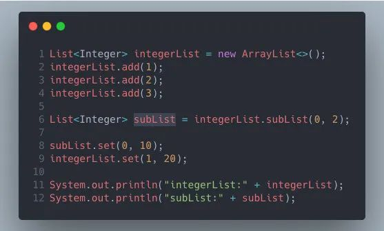 除了 Arrays#asList产生新集合与原始数组互相影响之外,JDK 另一个方法 List#subList 生成新集合也会与原始 List 互相影响。