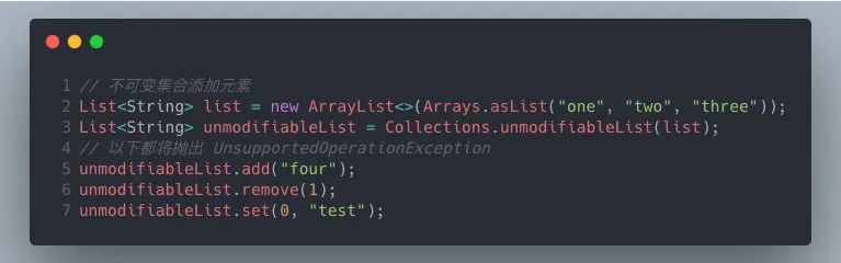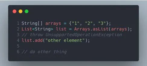 这段代码表面看起来没有任何问题,编译也能通过,但是真正测试运行的时候将会在第 4 行抛出 UnsupportedOperationException。