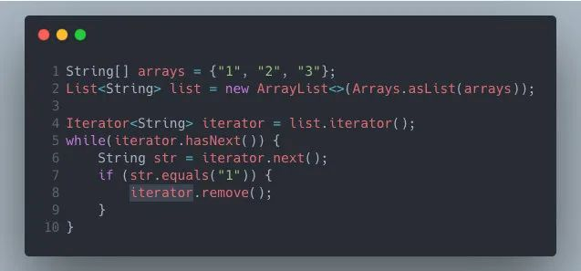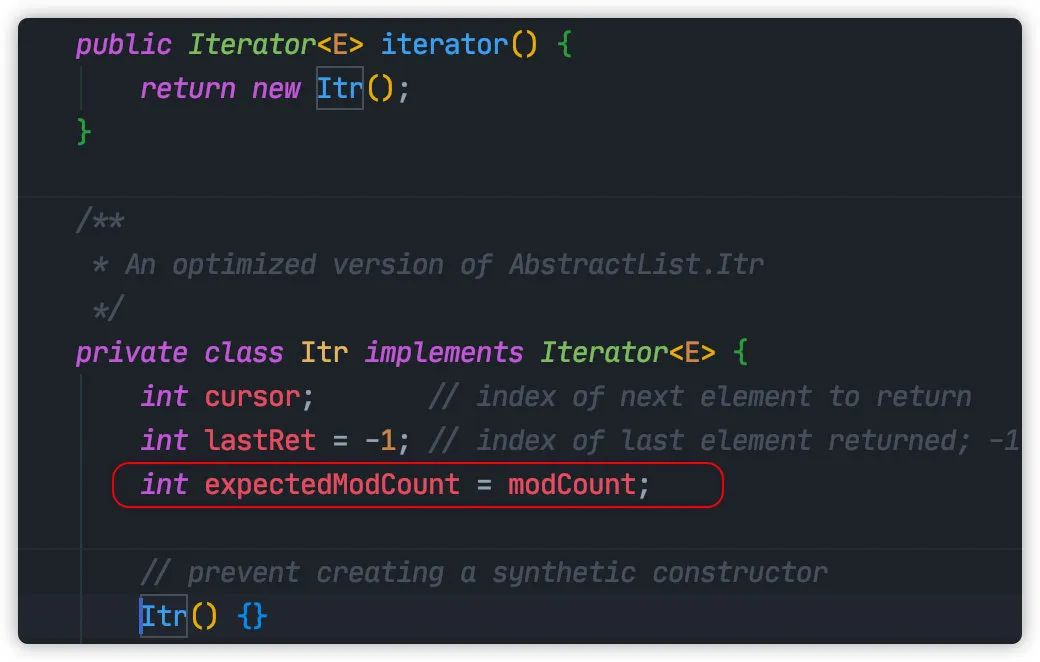 可以看到程序最终错误是由 ArrayList$Itr.next 处的代码抛出,但是代码中我们并没有调用该方法,为什么会这样?