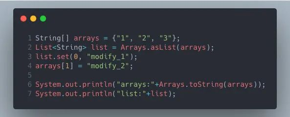 李鬼 ArrayList 除了不支持增删操作这个坑以外,还存在另外一个大坑,改动内部元素将会同步影响原数组。