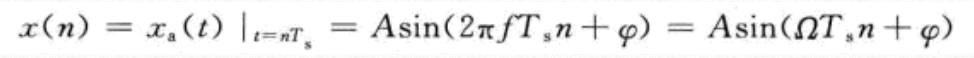 其中A为幅度,fi为初相,w为角速度,也称为数字频率,单位是弧度,表征信号变化快慢。上式可以看作是由下式的模拟信号采样而来