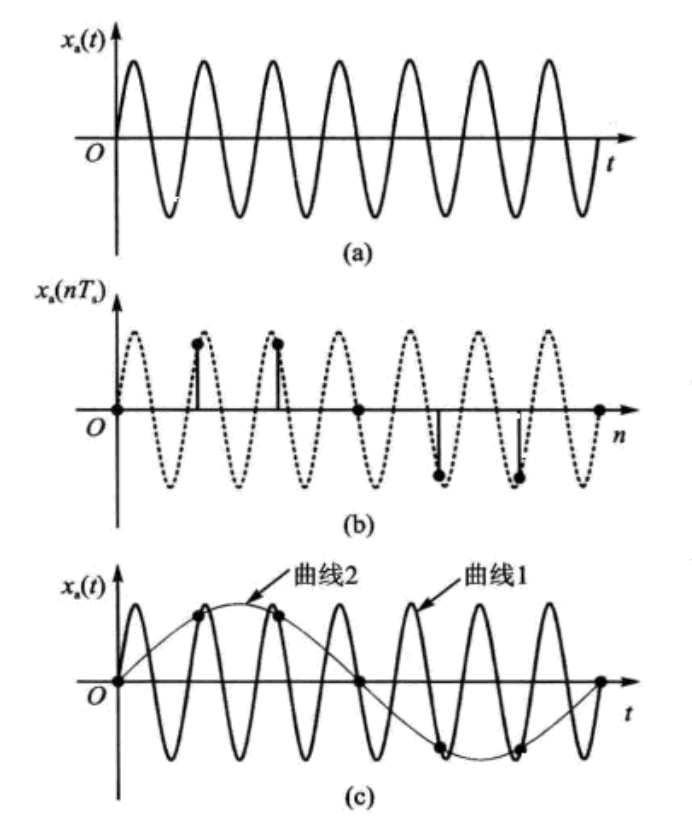 C中高频信号实际位7个周期,频率为7,如果采样频率为6HZ,那么采到的信号恰好为1个周期,也就是通过采样后恢复的信号是一个1Hz的正弦信号,这样显然是错的。