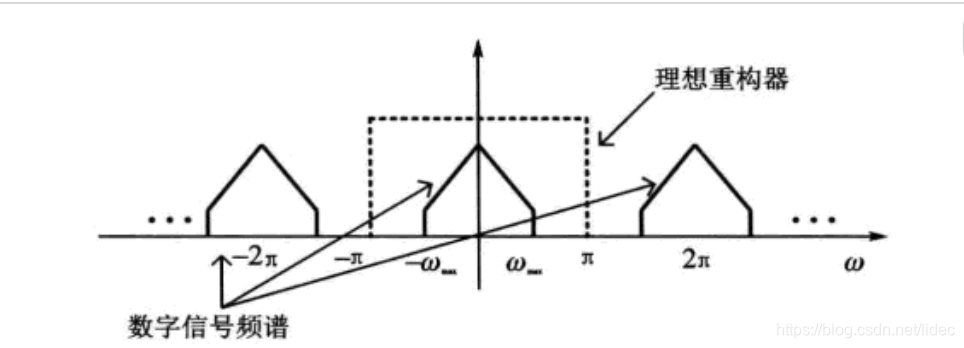 谈完了采样,在看一下恢复,也就是数字信号恢复成模拟信号时遇到的问题。由上文可知,在满足采样定理的条件下,模拟信号和数字信号包含的信息是一样的,另一方面,采样得到数字信号的频谱是延拓的,这样就会导致除了真正的信号,还可能包含相位相差2Pi的高频信号。所以在输出时需要一个低通滤波器,在频域上圈住-Pi~Pi的范围,这样就去除了高频延拓,用这样的频域信号恢复到时域就是原先的时域信号。