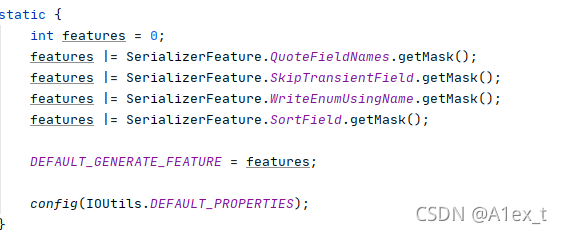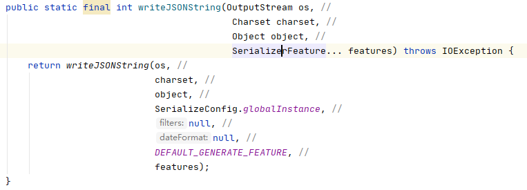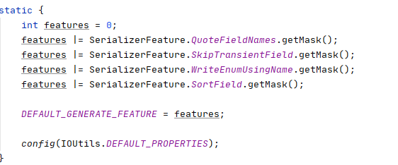 知道feature的运作方式后,我们再回过头看writeJSONString方法,当我们不去安排features的时候,我们使用了fastJSON提供的默认生成特征,