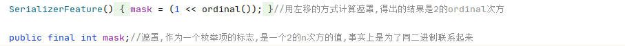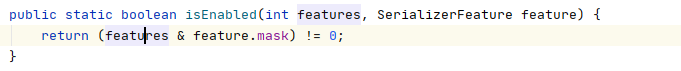 原来如此,这里的features其实就是指的所有的features,每一个feature的状态在其中占着一位,而是哪一位则由SerializerFeature的ordinal顺序所决定,比如我们的一个feature(QuoteFieldNames),在枚举类的顺序为第一位,所以得到它的mask为1,而现在我们初始化我们的feature配置为一个数字9,即二进制表示为1001,当我们去判断该配置是否开启时,将两者传入isEnable方法,如果features的最后一位为1,则作与运算后必然会的到1,结果不为0,从而达到检测的目的.这个mask的目的就是相当于枚举类的一个识别面罩,方便用于运算.