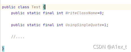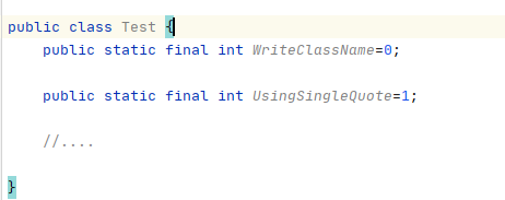 这样做确实比较方便,但是fastJSON却选择的是将SerializerFeature作为枚举类来实现这种配置功能.这样做的原因是什么呢,因为使用静态常量的话,方法实际上传入了一个int参数,这样就可能导致出现用户输入错误的参数的情况发生,也可能由于发生计算的情况导致参数类型错误,所以使用枚举类后,可以直接在方法中指定入参必须是序列化特征类中的枚举项,同时与int撇清了关系,解决了使用安全上的问题,同时也减少了代码量(省去一大串的修饰符和与功能无关的int值)