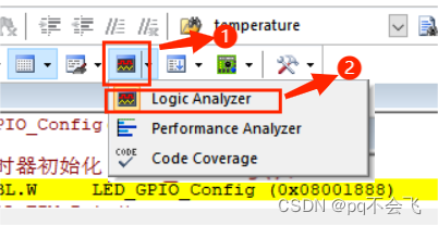 逻辑分析窗口:按下该按钮会弹出一个逻辑分析窗口,通过 SETUP 按钮新建一些 IO 口,就可以观察这些 IO 口的电平变化情况,以多种形式显示出来,比较直观。