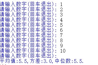 print("平均值:{},方差:{:.2},中位数:{}.".format(m, dev(n,m),median(n)))