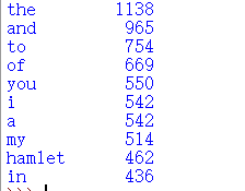 def getText():txt = open("hamlet.txt", "r").read()txt = txt.lower()for ch in '!"#$%&()*+,-./:;<=>?@[\\]^_‘{|}~':txt = txt.replace(ch, " ")   #将文本中特殊字符替换为空格return txt