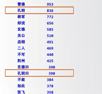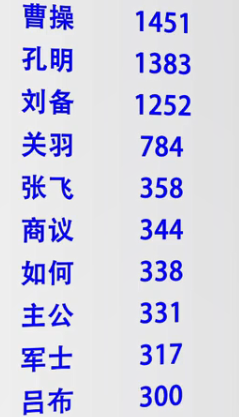 for word in words:if len(word) == 1:continueelif word == "诸葛亮" or word == "孔明曰":rword = "孔明"elif word == "关公" or word == "云长":rword = "关羽"elif word == "玄德" or word == "玄德曰":rword = "刘备"elif word == "孟德" or word == "丞相":rword = "曹操"else:rword = wordcounts[rword] = counts.get(rword,0) + 1