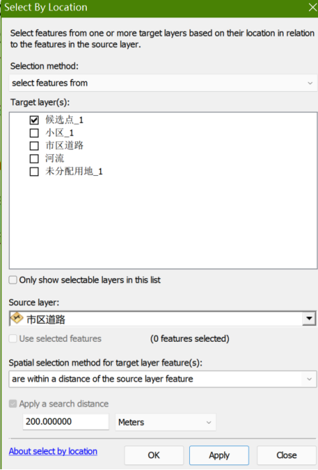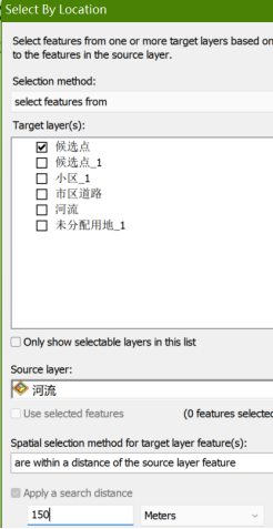 我们依旧打开【选择】|【按位置选择】,目标图层选择“候选点”,源图层选择“河流”,目标图层要素的空间选择方法选择:在源图层要素的某一距离范围内,应用搜索距离选择:150米应用即可。