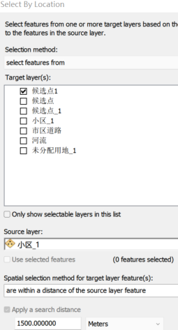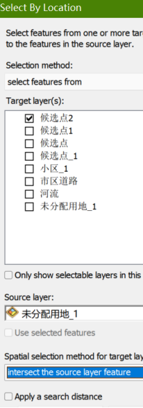 这时候我们继续打开【选择】|【按位置选择】,目标图层选择“候选点2”,源图层选择“未分配用地_1”,目标图层要素的空间选择方法选择:与源图层要素相交,注意:不应用搜索距离,导出高亮选中的要素“候选点3”即可。