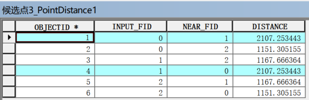 根据点距离表我们可以看到候选点“FID”字段为0和1的两个点满足距离大于2000米,在“候选点3”选中“FID”字段为0和1的点导出为“垃圾场”即可得到符合条件的垃圾场候选点。