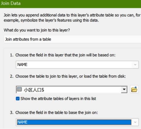 1.首先我们将“小区_1”和“小区人口表”根据“NAME”字段连接起来,这时候我们可知每个小区上面有多少人了。