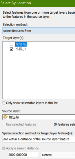 2.我们打开【选择】|【按位置选择】,目标图层选择“小区_1”,源图层选择“垃圾场”,目标图层要素的空间选择方法选择:在源图层要素的某一距离范围内,应用搜索距离选择:2000米。