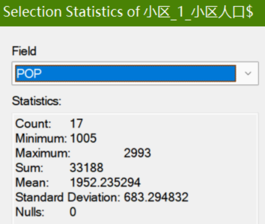 这时候我们可以看到距离垃圾场2000米范围内的小区已经被高亮显示了,我们直接打开“小区_1”属性表后选中“POP”字段右键选中【统计】即可查看选中小区的总人口数量是:33188人。