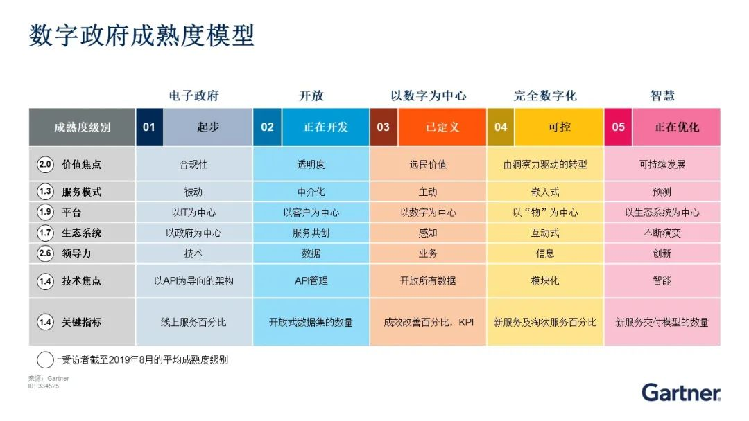 以价值焦点、服务模式、平台、生态系统、领导力、技术焦点和关键指标七大维度,Gartner总结出一套“数字政府成熟度模型”(如下图),通过对照评估,可粗略判断出政府当前的数字化程度与能力缺陷。
