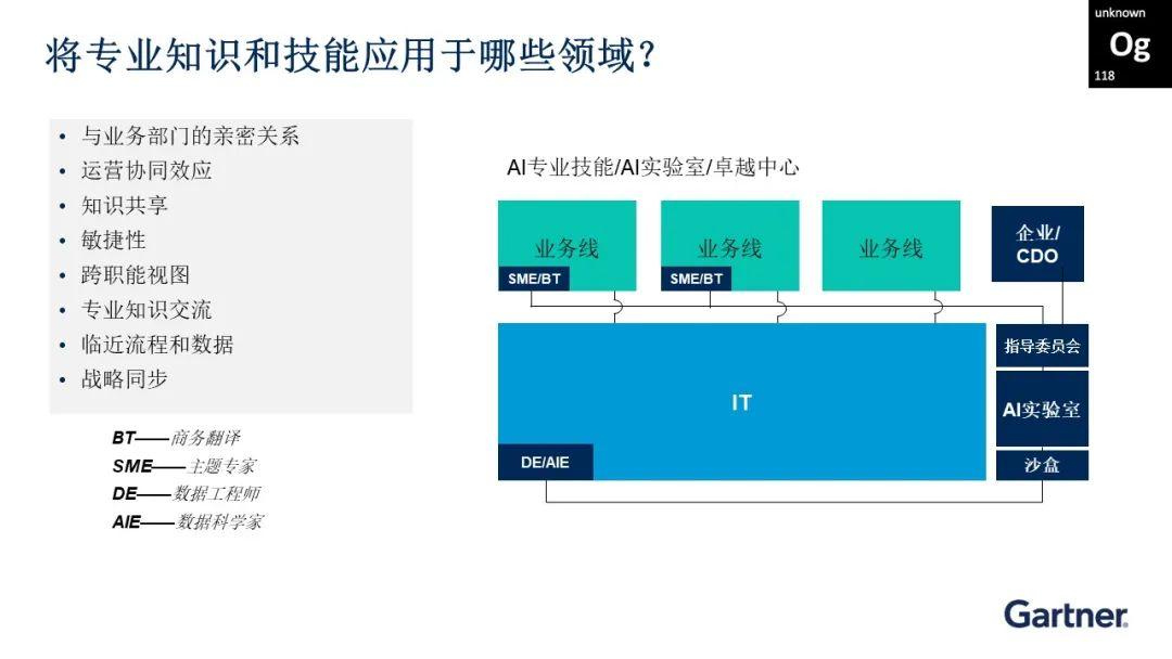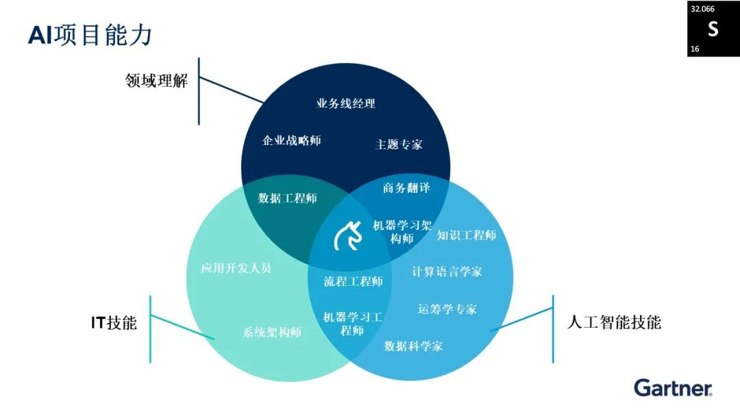 第二是技能。在传统的人工智能项目里,Gartner把技术人才分成三类:精通业务的领域专家、理解数据的IT人才、人工智能领域专家。只有通过三类专家的结合,才有可能实现人工智能方案的落地。