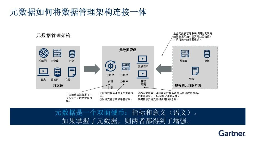 最后也是最为关键的部分——元数据的管理,如何通过元数据的管理让冗杂的数据变成有价值的、可理解的信息。在应用数据时,通过元数据整体架构,把所有多维度的数据源利用统一的视角来提供给业务与IT。