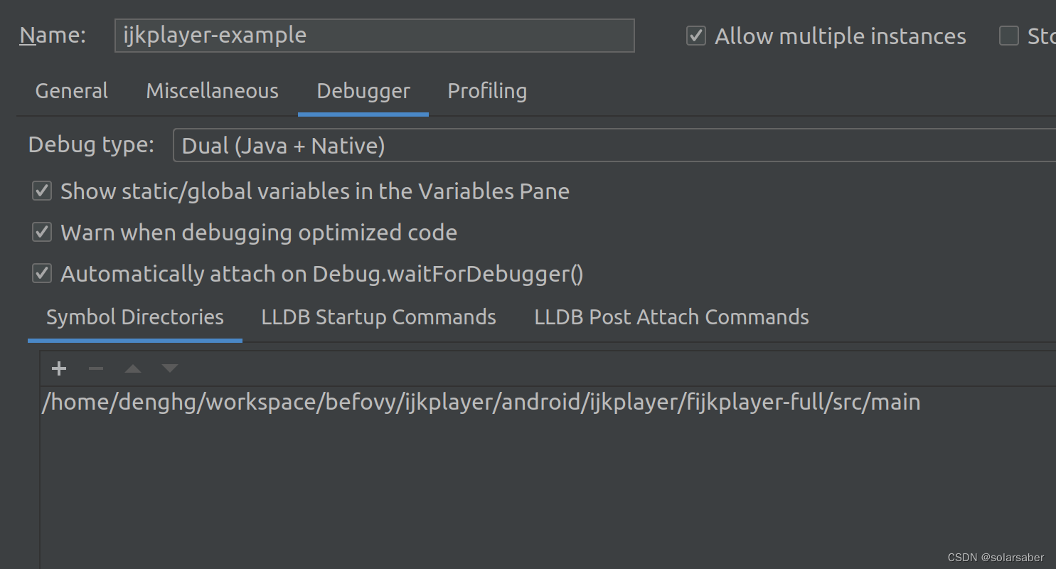 首先这里configuration一定要选上ijkmedia的目录不然进不了c 的debug