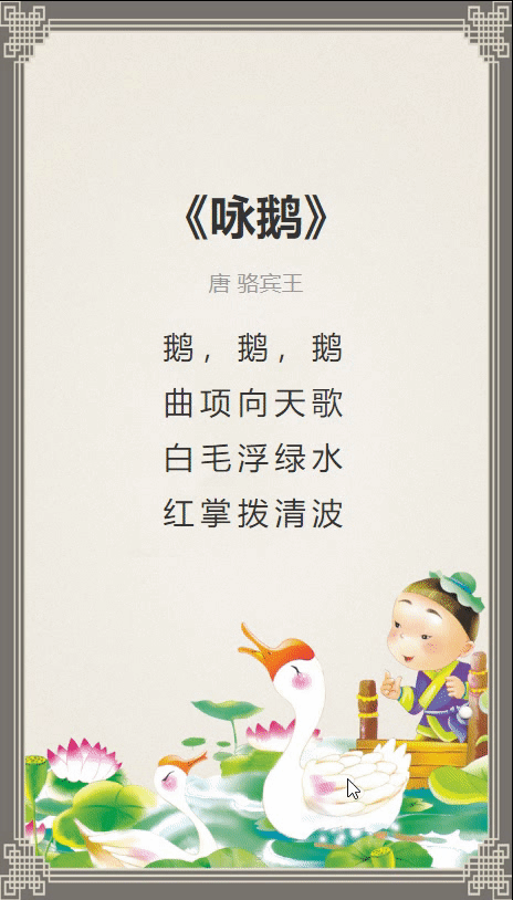以一首骆宾王的《咏鹅》为例,制作一个css3动画文字效果,文字动画规则:从左向右缓慢进入,并且文字从透明再过渡到不透明,另外每段话完了后,有个时间间隔,也就是延时多少秒再开始动画。