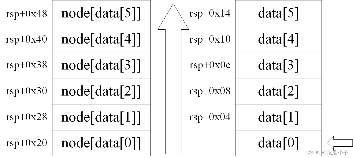 所以此时传入了 6 个参数,4 个存入寄存器,2 个存入栈。此时可通过访问 rsi(注意,上层函数的 rsp 即等于此处 rsi )查看 6 个数。返回到上层 phase_2