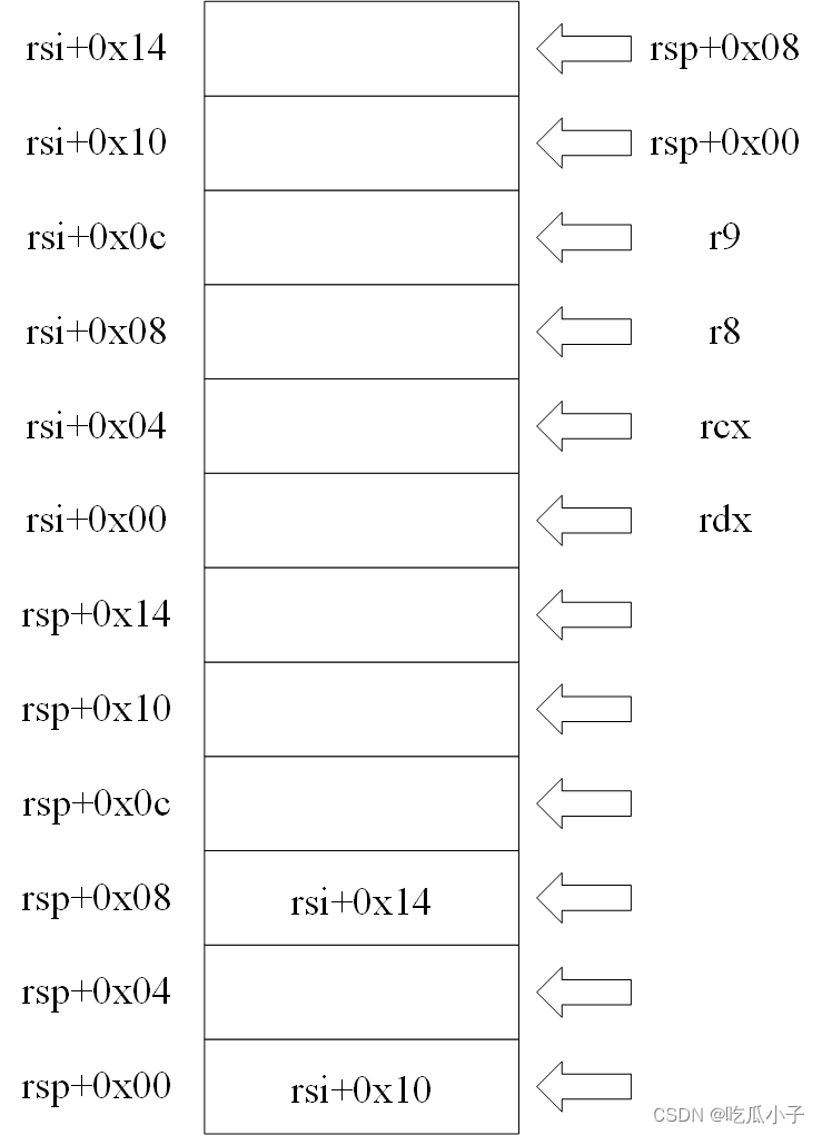 直接看不直观,建议自己画个栈,以 rsi 为头,跟着走一遍,箭头代表指向,最终如下: