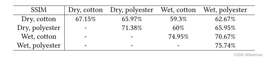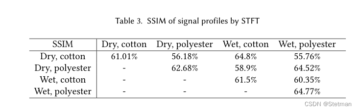 上图为基于CRS从干尿布和湿尿布中提取的信号剖面。我们可以观察到,无论使用者穿的是棉裤还是涤纶裤,干尿布的信号分布都是相似的。然而,即使使用者穿着同样的裤子,干尿布的信号分布也与湿尿布不同。为了量化信号剖面之间的相似性,我们计算了结构相似指数(SSIM),它衡量了两幅图像之间的结构差异。SSIM值越大,说明两个配置文件的相似度越高。如下表所示,相同设置(湿/干尿布、棉/涤纶裤子)的信号剖面之间的SSIM最高。