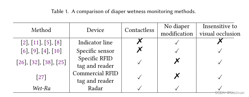 如今,尿不湿成为婴幼儿和部分病人的必备品。为了保证卫生,我们需要持续检查其湿度。随着技术的发展,人们要求这个过程中避免尴尬,即在视觉遮挡的前提下检查。而这方面的研究早就有人进行,目前主要有两种方式:1.湿度指示剂;2.传感器检测。前者的指示剂无法及时反应湿度,只会在湿了之后变色,导致医护人员要不断进行检查;而后者存在诸多问题:传感器贴上的不适、更换尿不湿时传感器要进行装卸等。而本文介绍的Wet-Ra不存在这些问题。其利用射频信号实现了无接触、普适性、连续性的尿片湿度监测。无需视觉检查和传感器位移,使系统方便和用户友好。