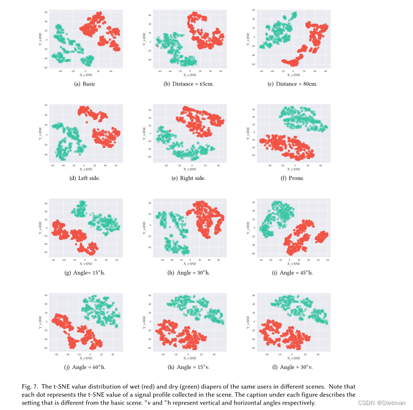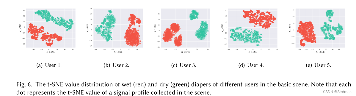 这表明,根据雷达反射信号的CRS来区分尿布的湿润程度是可能的。我们进一步将t分布随机嵌入(t-SNE)应用到信号剖面上,可视化了不同用户在不同状态下湿尿布和干尿布的信号剖面分布。下图6为同一场景下不同用户的t-SNE值分布,图7为单个用户在不同场景(角度、距离、睡姿)下湿尿布和干尿布的t-SNE值分布。我们可以观察到,在图6和图7中,湿尿布和干尿布的t-SNE值分布是很好的分离。注意,图6和图7中的点云方向与t-SNE无关,因为t-SNE主要区分的是不同类别。