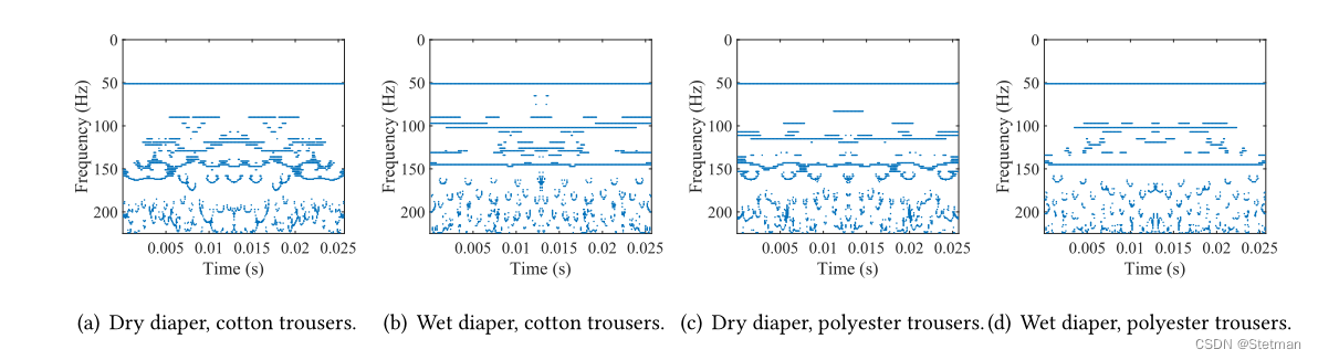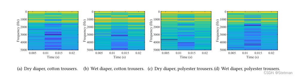 为了验证我们所选方案的效果,我们比较了wmst处理后的信号和STFT处理后的信号。如上图所示,STFT提取的湿尿布和干尿布的信号剖面没有明显的规律。(如图(a)和图(b)所示,干尿布的信号谱与湿尿布的信号谱有显著差异。提取清晰、清晰的信号剖面是准确预测尿布湿度的必要条件。