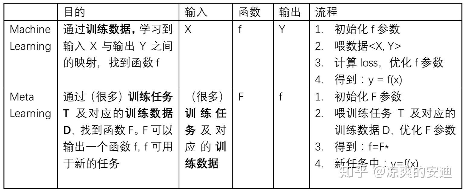 二者的目的都是找一个Function,只是两个Function的功能不同,要做的事情不一样。机器学习中的Function直接作用于特征和标签,去寻找特征与标签之间的关联;而元学习中的Function是用于寻找新的f,新的f才会应用于具体的任务。