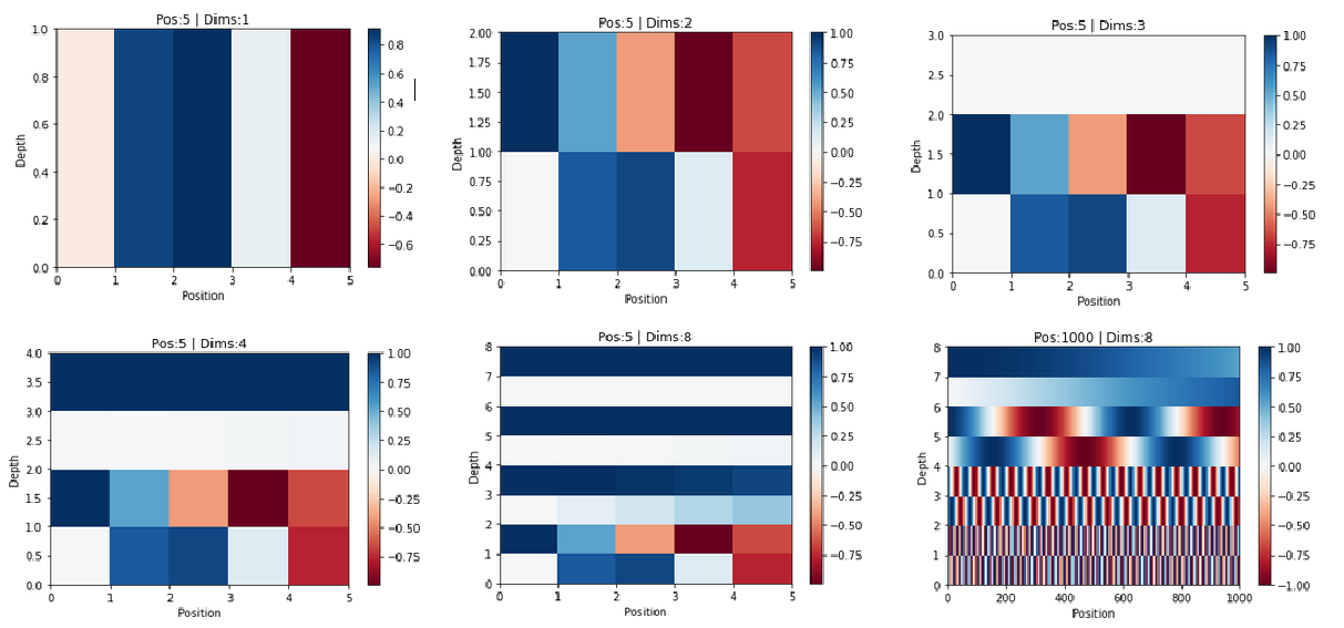 这很好地捕获了沿时间维度(或等式中描述的 pos 维度。我将 pos 和 time 互换使用,因为它们意味着相同的事情)但是如何也捕获沿dims维度的相对位置信息呢? 这里的答案也在于等式本身。 ω 项。
