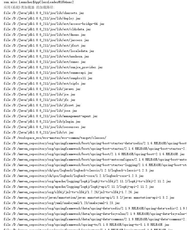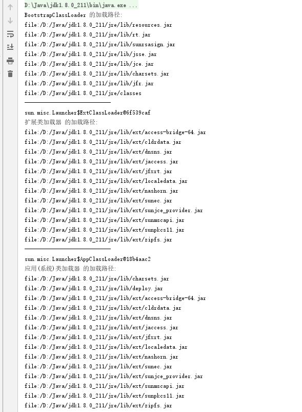 public class ClassPath_of_Bootstrap_Ext_AppClassLoader {public static void main(String[] args) {System.out.println("BootstrapClassLoader 的加载路径: ");URL[] urls = sun.misc.Launcher.getBootstrapClassPath().getURLs();for (URL url : urls) {System.out.println(url);}System.out.println("----------------------------");//取得扩展类加载器URLClassLoader extClassLoader = (URLClassLoader) ClassLoader.getSystemClassLoader().getParent();System.out.println(extClassLoader);System.out.println("扩展类加载器 的加载路径: ");urls = extClassLoader.getURLs();for (URL url : urls) {System.out.println(url);}System.out.println("----------------------------");//取得应用(系统)类加载器URLClassLoader appClassLoader = (URLClassLoader) ClassLoader.getSystemClassLoader();System.out.println(appClassLoader);System.out.println("应用(系统)类加载器 的加载路径: ");urls = appClassLoader.getURLs();for (URL url : urls) {System.out.println(url);}System.out.println("----------------------------");}