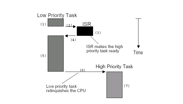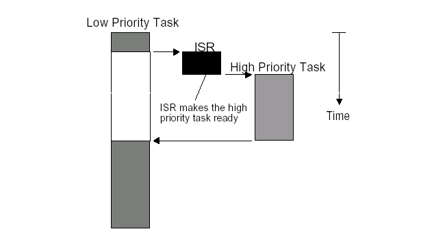 使用抢占式内核可以保证系统响应时间. 最高优先级的任务一旦就绪, 总能得到CPU的使用权。当一个运行着的任务使一个比它优先级高的任务进入了就绪态, 当前任务的CPU使用权就会被剥夺,或者说被挂起了,那个高优先级的任务立刻得到了CPU的控制权。如果是中断服务子程序使一个高优先级的任务进入就绪态,中断完成时,中断了的任务被挂起,优先级高的那个任务开始运行。