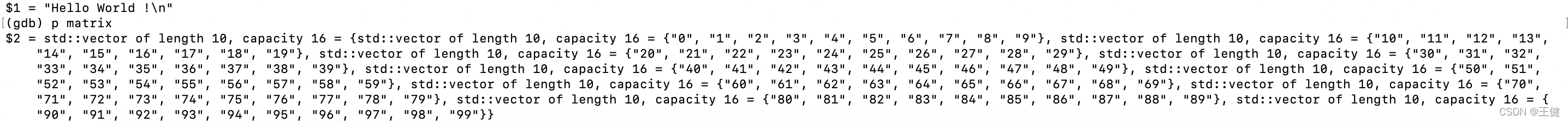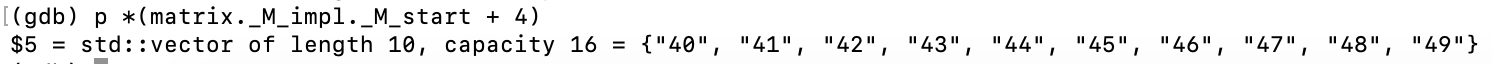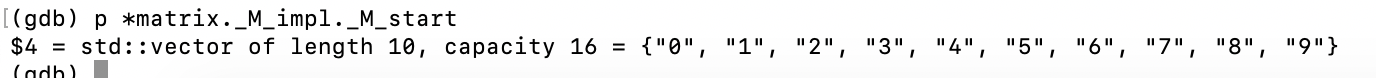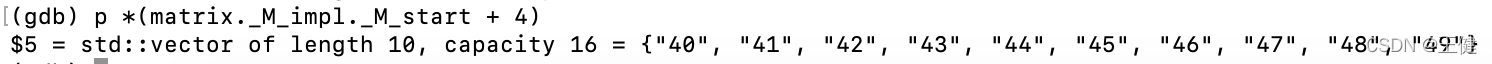 通过地址偏移打印其他元素的位置,如打印第5个元素的内容, 命令为“p *(matrix._M_impl._M_start + 4)”(索引下标从0开始):