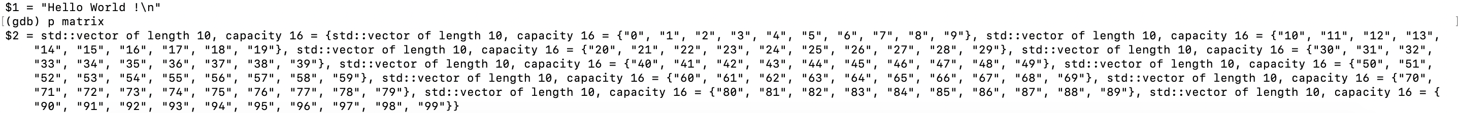 {std::vector> matrix;for (int i = 0; i < 10; ++i) {matrix.push_back(std::vector());for (int j = 0; j < 10; ++j) {matrix[i].push_back(std::to_string(i * 10 + j));}}std::string str = "Hello World !\n";printf("ok\n");