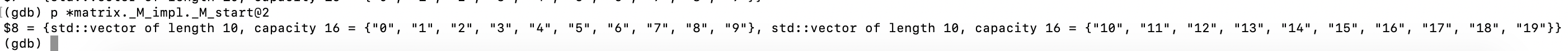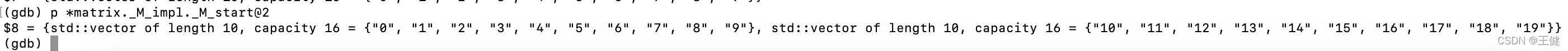 除此之外,还可以通过“p *matrix._M_impl._M_start@N”打印前N个元素(N从1开始),如打印前两个元素: