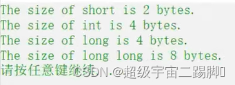 {printf("The size of short is %d bytes.\n", sizeof(short));printf("The size of int is %d bytes.\n", sizeof(int));printf("The size of long is %d bytes.\n", sizeof(long));printf("The size of long long is %d bytes.\n", sizeof(long));return 0;