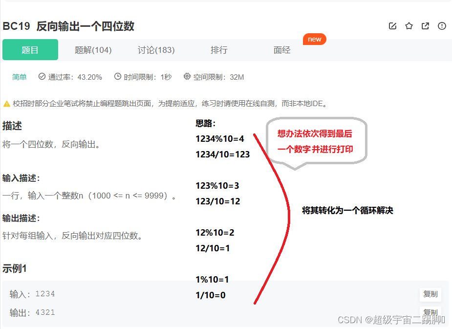 % c - 字符 % hd - 短 整形 % d - 整形 % s - 字符串 % f - 单精度浮点数 % lf - 双精度浮点数 % p - 地址格式 ... ... (注:严格按照题目要求的格式输出,才能保证正确性) 格式参考:https://zh.cppreference.com/w/c/io/fscanf5. (简单)BC19-反向输出一个四位数_牛客题霸_牛客网 (nowcoder.com)